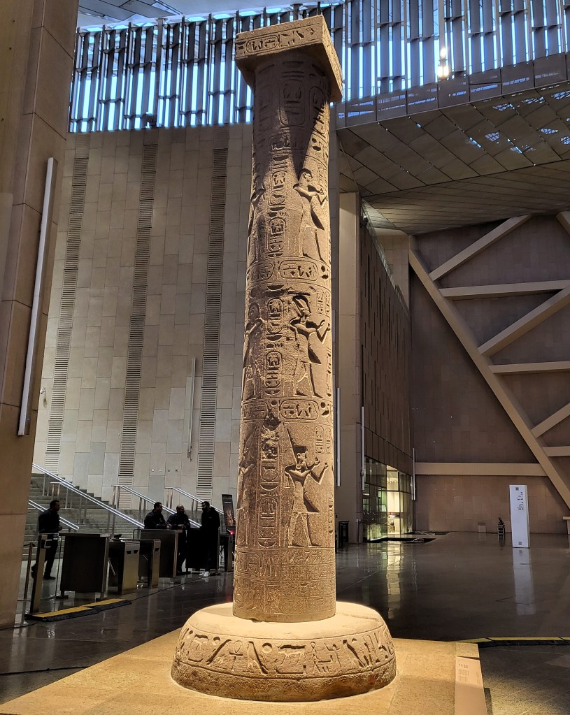 The Victory Column of Merneptah (GEM 22711) in the atrium of the GEM, was originally erected at Heliopolis to commemorate his victory against the Libyans and the Sea Peoples. The entrance to the Tutankhamun Experience is behind and to the left (Author Photo).